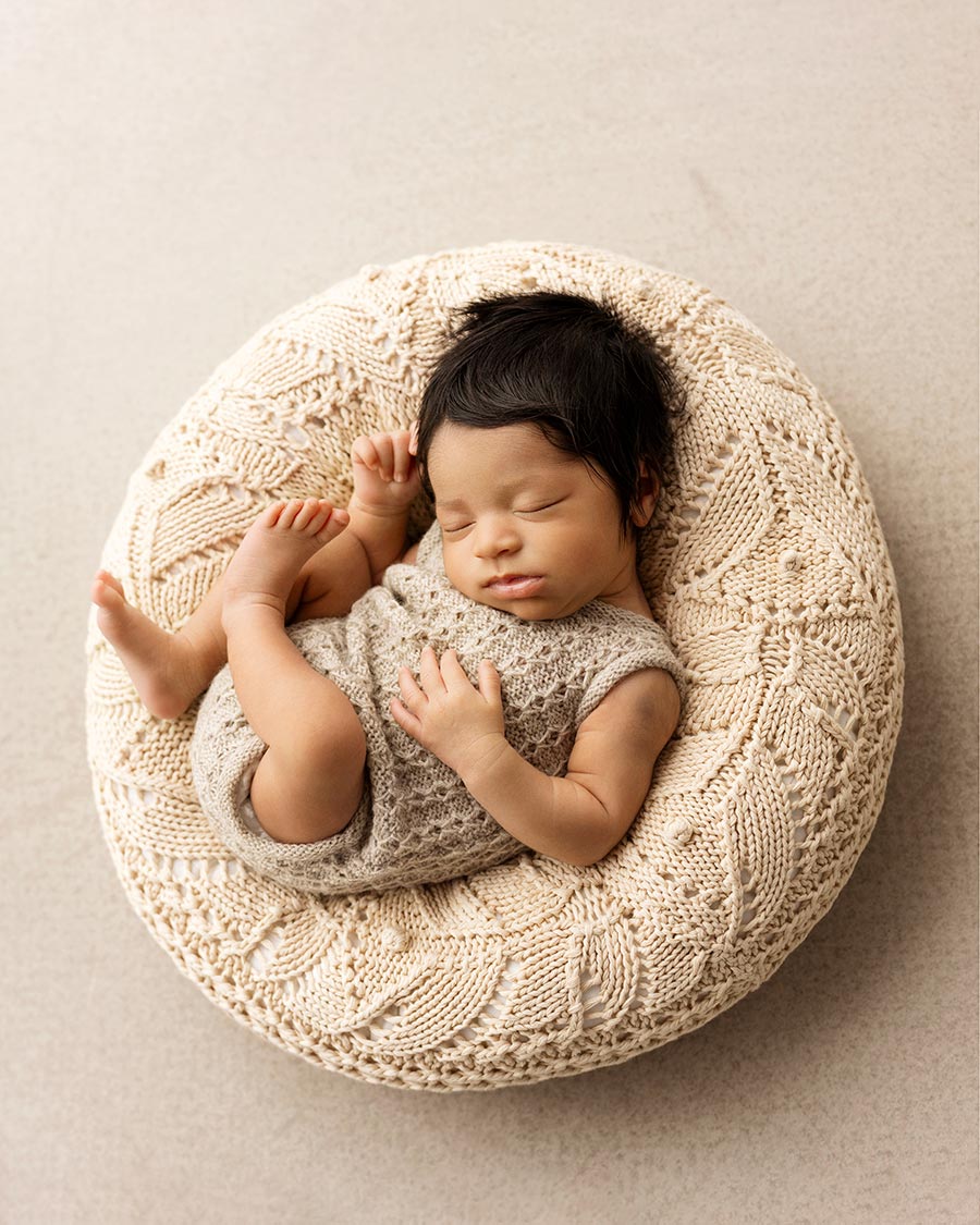Elevate your newborn photography with this carefully curated Exclusive Line newborn photography props girl set, designed for professionals who value quality and timeless appeal. The centrepiece—a hand-knitted poser cover in ranch tan—features a stunning textured pattern with delicate bubble details. Its warm, neutral tone provides versatility, making it perfect for both boys and girls. The Exclusive Line poser cover is crafted in small batches, making it a rare find that won’t be restocked.